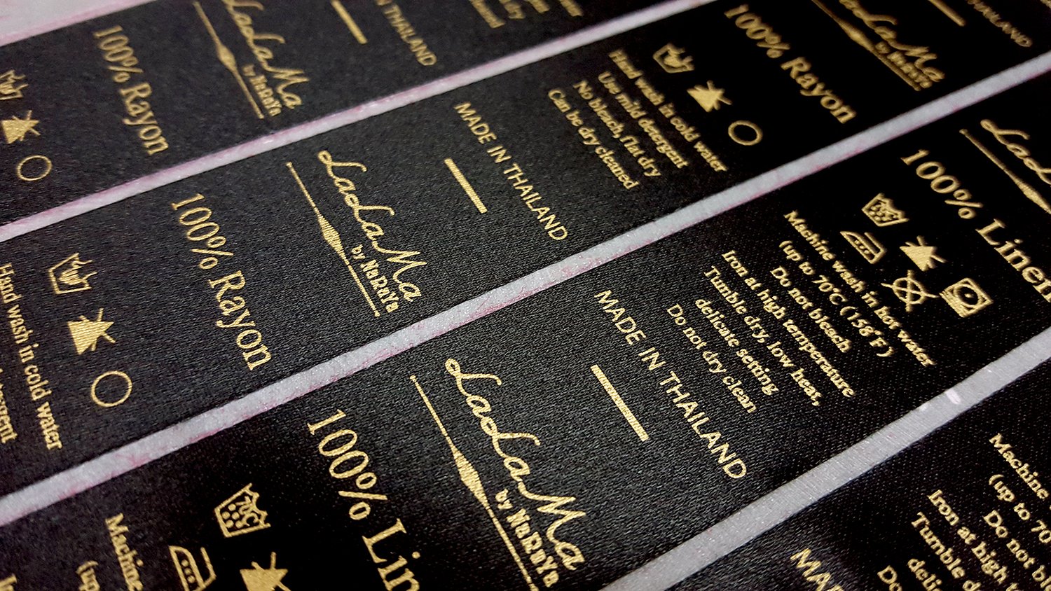 เราให้บริการสั่งผลิตป้ายพิมพ์ลาเบล Brand Logo/ ป้าย Care Label สำหรับทำป้ายลาเบลติดคอเสื้อ / เสื้อผ้า / การเกง / กระโปรง / กระเป๋า ฯลฯ